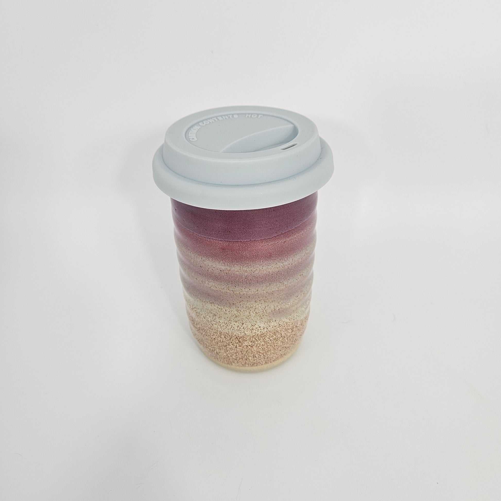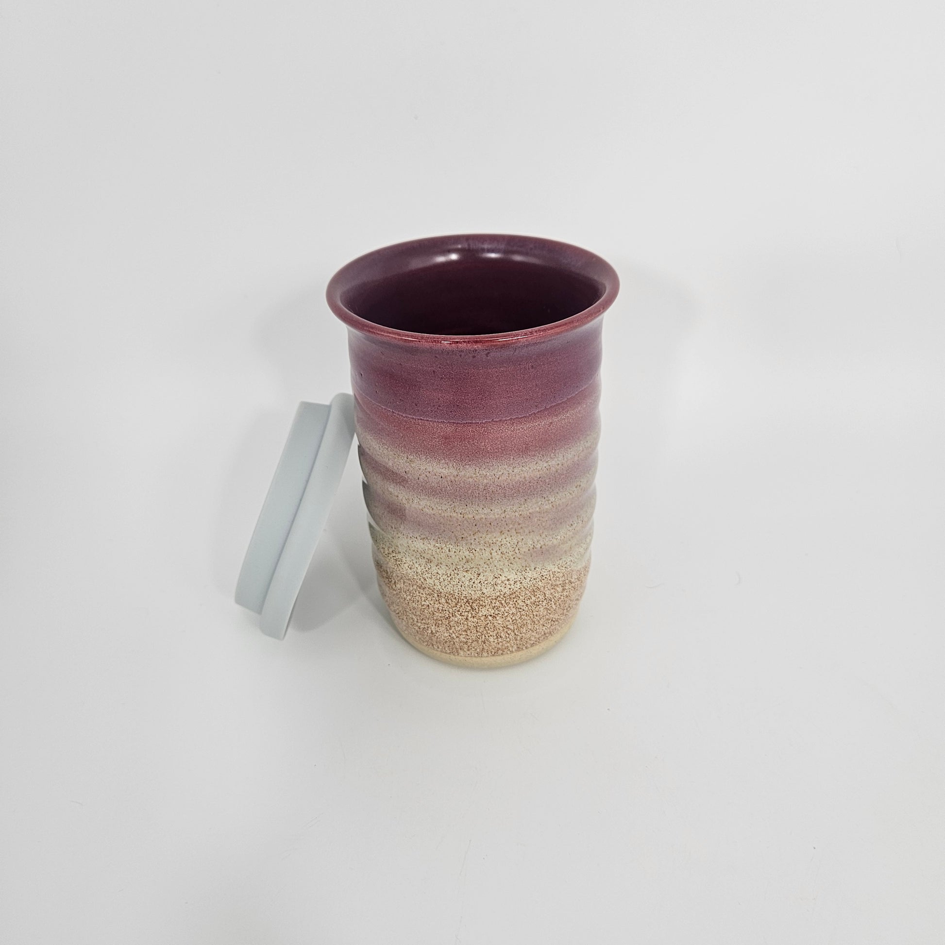 Tasse de voyage (12 oz) avec glaçure mixte "Red Wine" et "Snowflecks" sur argile unie. Cette pièce est livrée avec un couvercle en silicone ajusté.