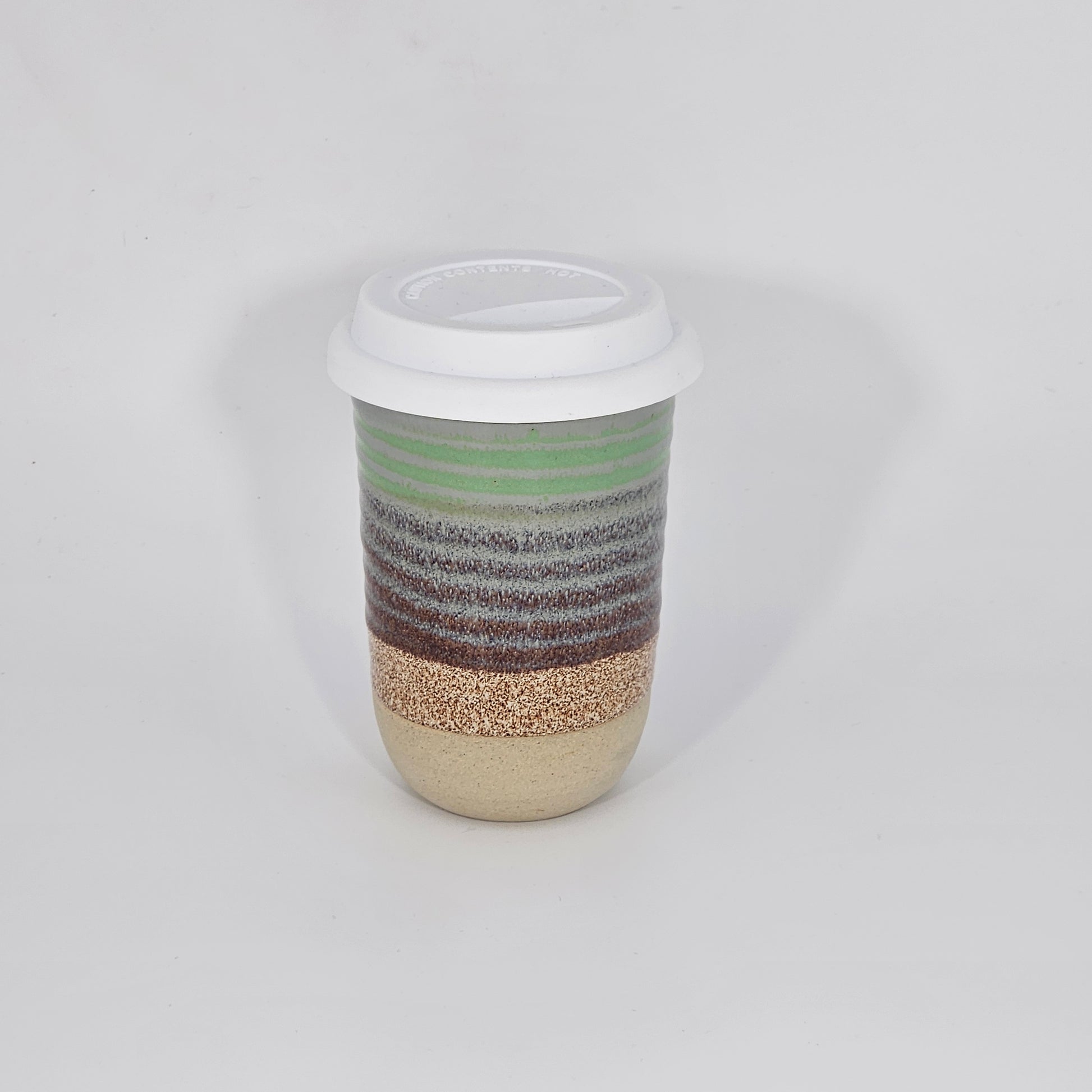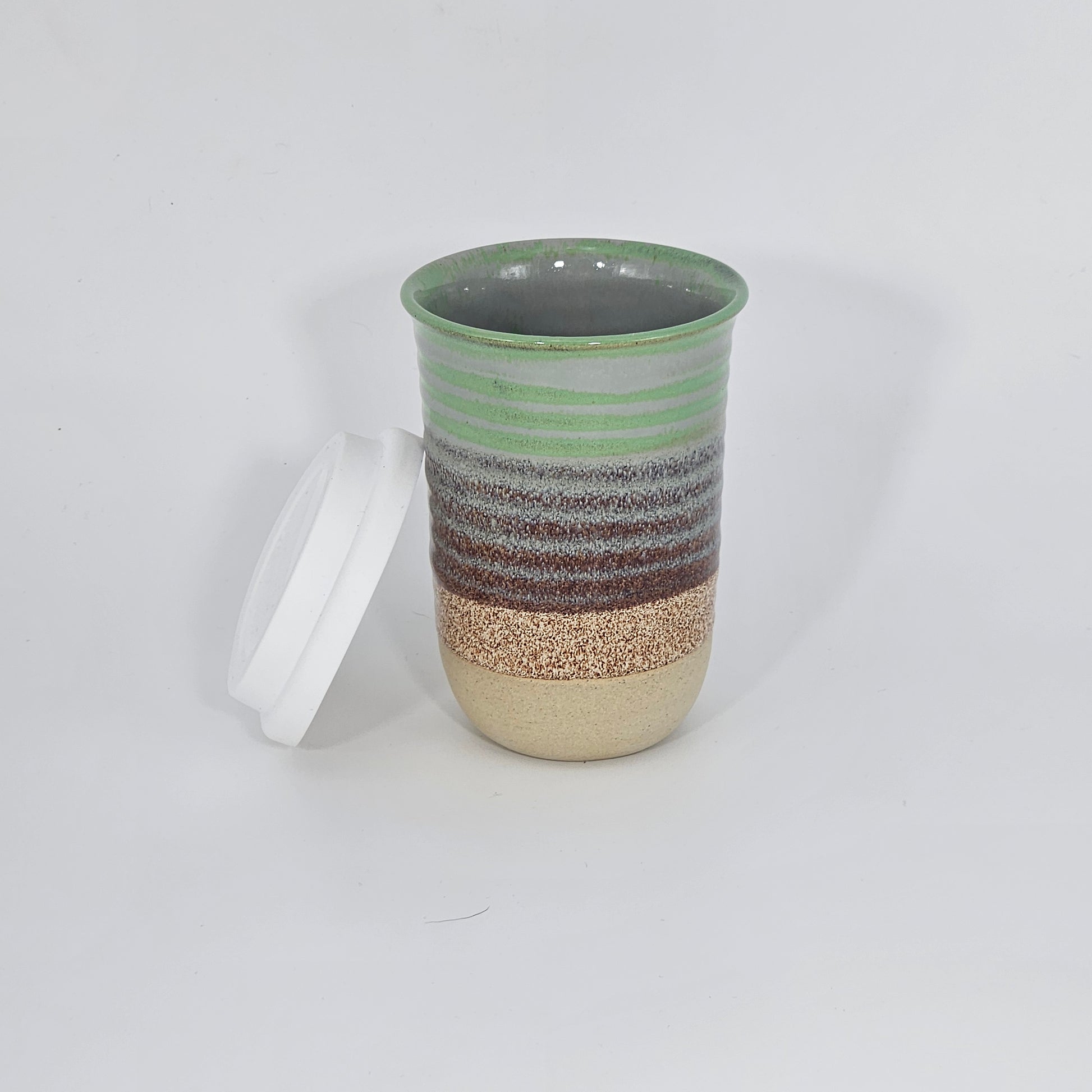 Travel tumbler and silicone lid with a Pumpernickel/Snowflecks glaze on a plain clay body.