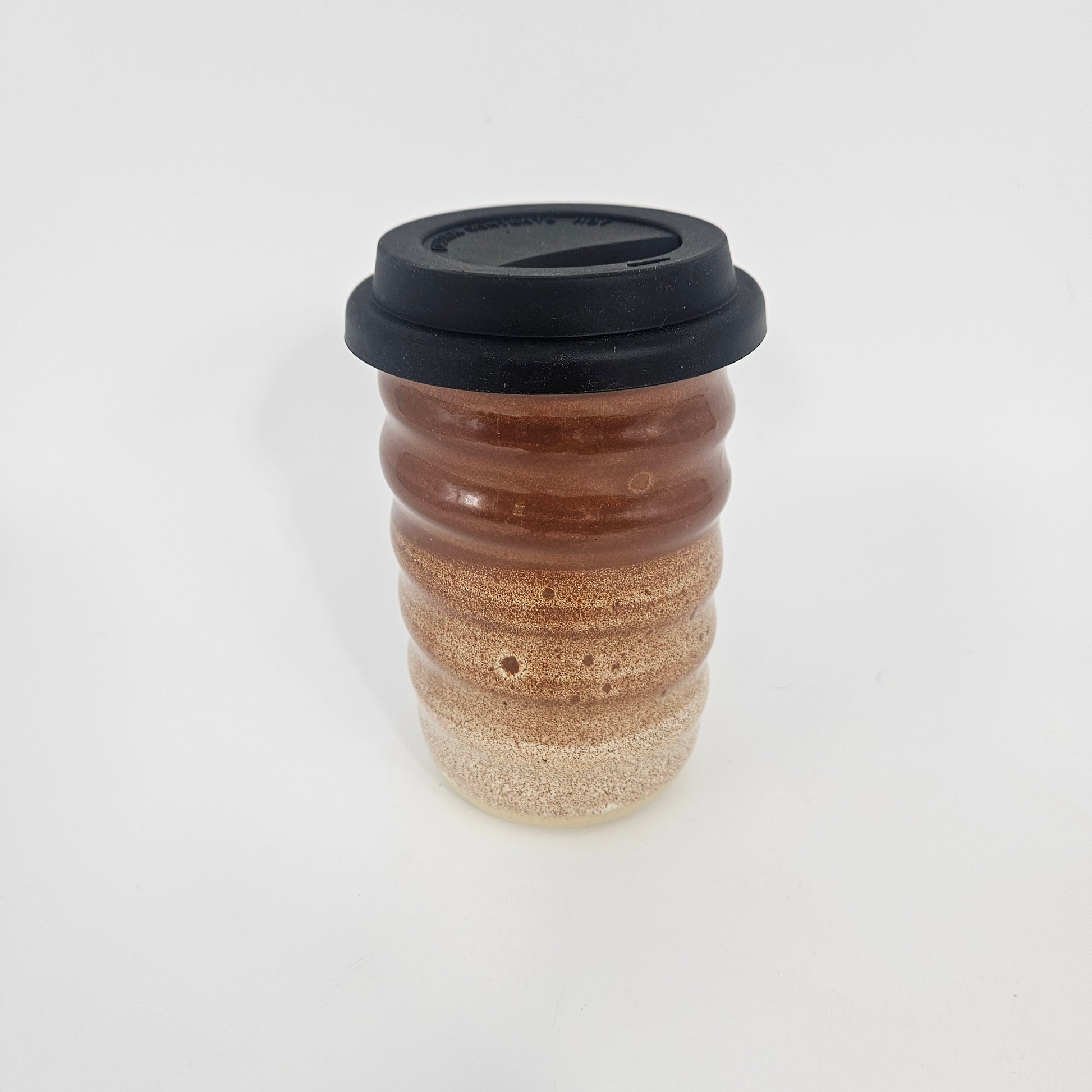 Travel tumbler and silicone lid with a Autumn Rustle/Snowflecks glaze on a plain clay body.